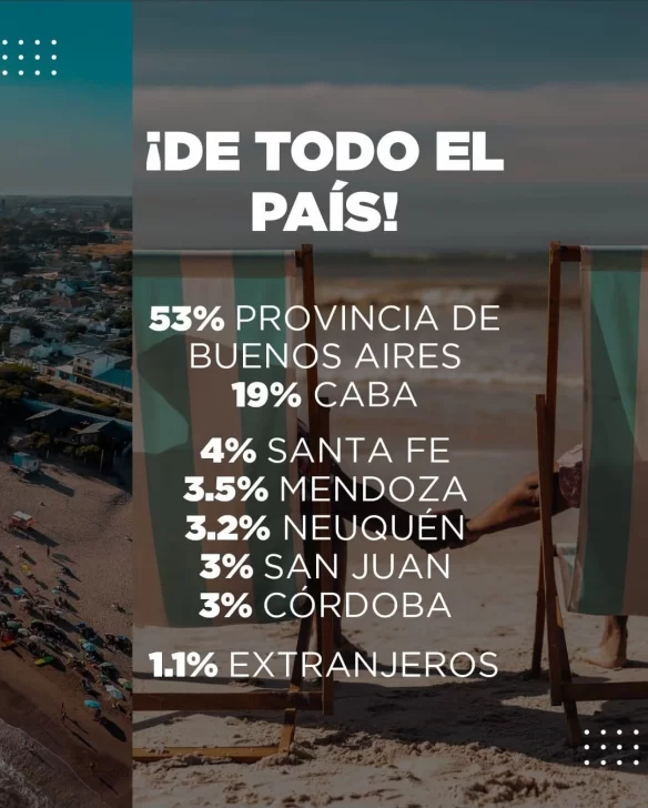 Cabe señalar que entre los destinos emisores se destacan provincia de Buenos Aires (53%) y 19 % (CABA), aunque nos visitan desde todo el país (Santa Fe, Mendoza, San Juan, Neuquén y Córdoba), y del extranjero.