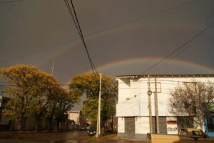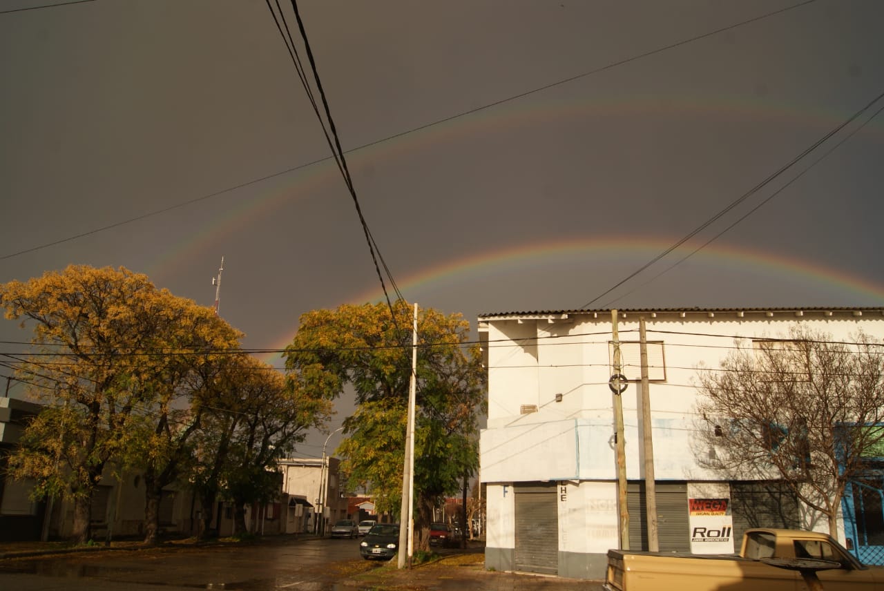 Pese a la lluvia y el mal clima el bello fenómeno del arco iris se hizo presente esta tarde brindando una postal diferente en la ciudad.