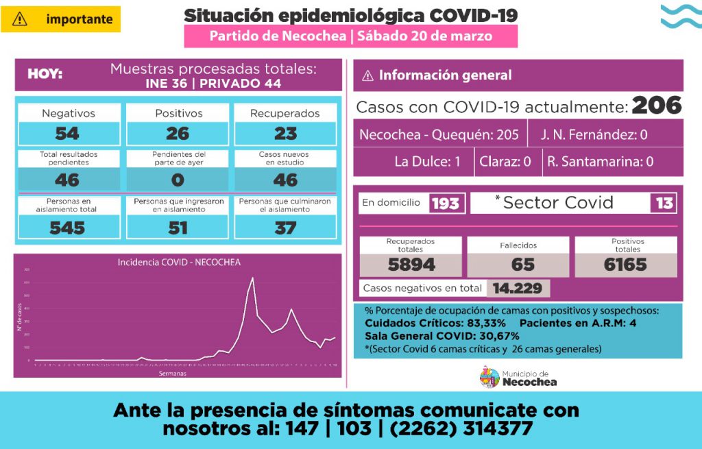 Según el parte de salud de este sábado se registraron 26 nuevos positivos de la enfermedad y se recuperaron 23 pacientes, haciendo un total de 206 casos activos.