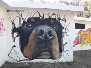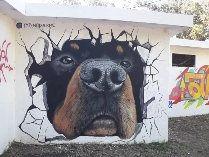 Un imponente mural en 3D engalana las paredes del anfiteatro en el parque Miguel Lillo. En las redes ha sido bautizado como “El Guardián del Parque”, un perro que asoma dando la sensación de romper el paredón.