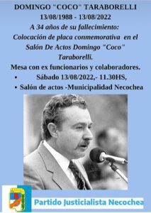 Primero se colocara una placa conmemorativa en el salón de actos del palacio municipal denominado José Domingo “Coco” Taraborelli y luego se llevará adelante una mesa con ex funcionarios y colaboradores de los gobiernos del prócer justicialista local.