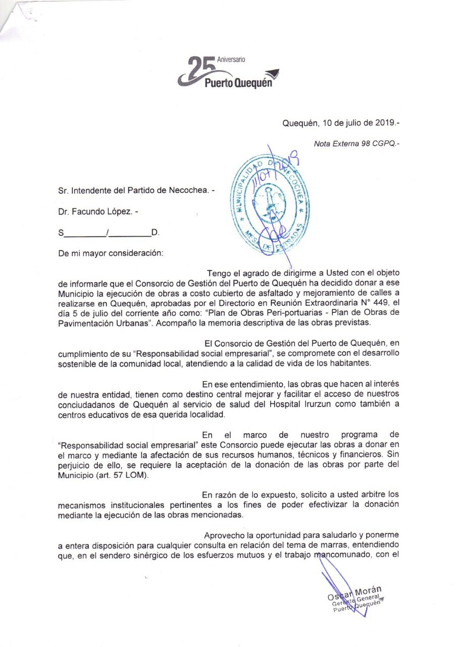 El Consorcio de Gestión de Puerto Quequén informó que notificó al intendente Facundo López, y al presidente del Concejo Deliberante, Ernesto Mancino, la decisión unánime del Directorio del Ente portuario de donar la ejecución del “Plan de Obras de Pavimentación Urbana”, a costo cubierto, de los accesos al hospital, escuelas y jardines de infantes de Quequén.