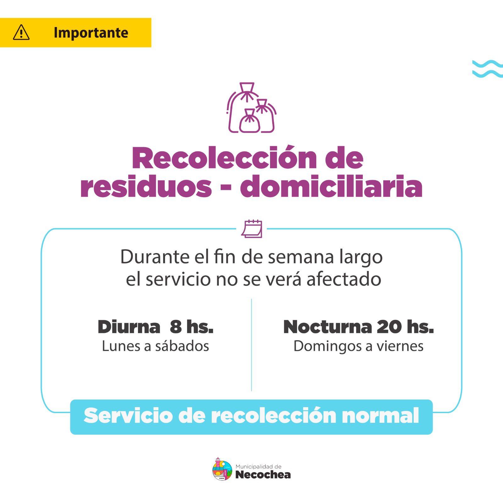 Desde el ámbito de la Secretaría de Planeamiento, Obras y Servicios Públicos de la Municipalidad, se informó en la víspera del fin de semana largo que el servicio de recolección de residuos domiciliaria no se verá afectado por el feriado.