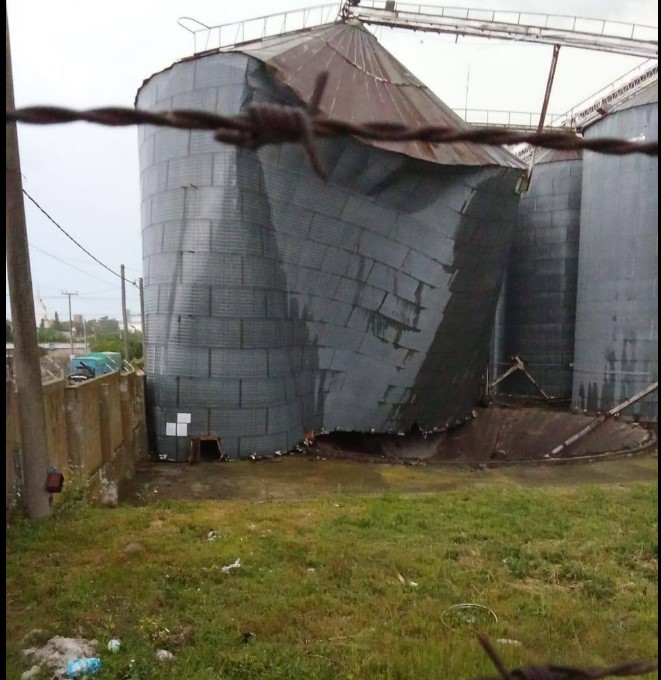 Además de reportarse caída de árboles, postes y voladura de techos, las intensas ráfagas provocaron también destrozos en esa planta cerealera, corriendo de lugar abollando uno de los silos.