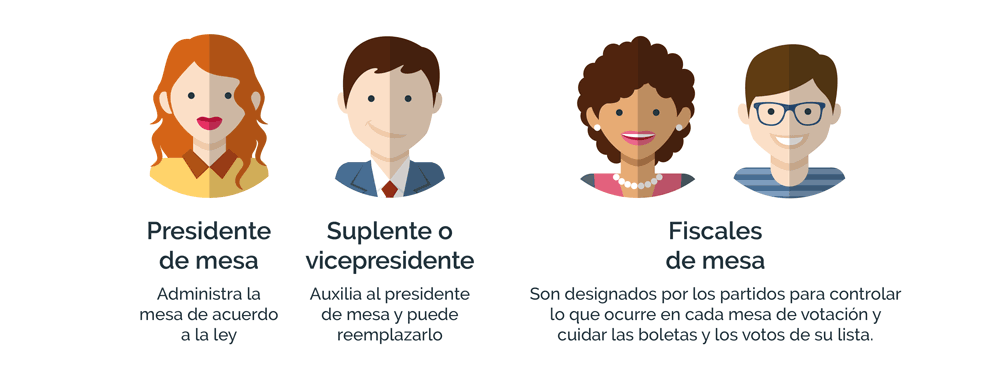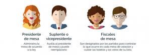 Los fiscales de mesa son designados por los partidos políticos para controlar la elección. Su función es vigilar lo que ocurre en las mesas de votación para asegurarnos que se respete la ley electoral y los derechos de los electores y cuidar los votos de su partido.