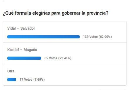 62,90 por ciento de los votos obtuvo en la última encuesta de nuestra web la fórmula María Eugenia Vidal – Daniel Salvador ante la pregunta de a quién votarías para gobernar la provincia.