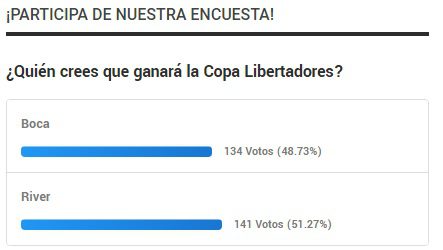Las opciones eran Boca y River en donde la gente eligió en su mayoría al conjunto del “Muñeco” Gallardo como el ganador donde con un 51, 27% de los votos,141 personas le dieron el voto positivo y creen que la entidad Millonaria será la próxima monarca del fútbol continental.