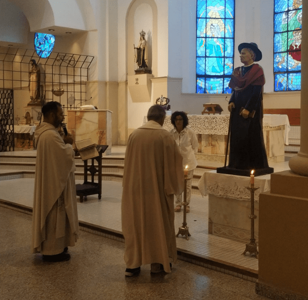 Con la bendición de los párrocos Fernando Mendoza y Alejandro Martínez, la nueva imagen del Cura Brochero quedó lista para ser ubicada en el templo.