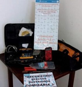 Al llegar al Objetivo en la calle 8 N° 4300 colaboraron los Gabinetes Técnicos Operativos de las Comisarias 1ra, 2da y el Comando de Patrulla, luego de ingresar acorde la reglamentación legal vigente y realizar una minuciosa búsqueda secuestraron la totalidad de los elementos sustraídos: un maletín negro rígido marca Fluke conteniendo instrumento de medición (osciloscopio), un bolso Bahco conteniendo herramientas varias.