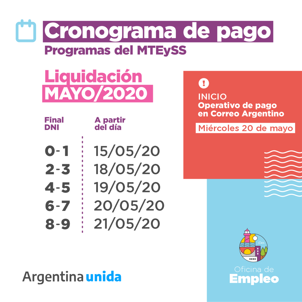 El cronograma que cubre las liquidaciones correspondientes a abril iniciará el próximo viernes 15 de mayo. Corresponden a los programas que impulsa el Ministerio de Trabajo, Empleo y Seguridad Social de la Nación.
