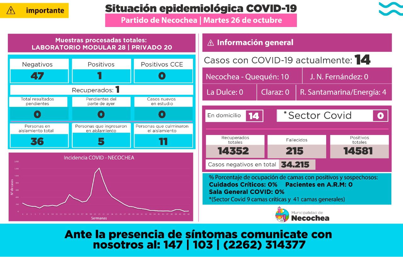 Desde el inicio de la pandemia el distrito de Necochea contabiliza 215 decesos, 14.581 contagios y 14.352 personas que lograron derrotar el virus Covid-19.