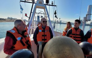 Trabajos que se llevan adelante e Acompañados por el Gerente General del Ente portuario, Oscar Morán, y el Jefe de la Prefectura Quequén, Prefecto Principal Marcos Antonio Luffi, a bordo del Guardacostas GC-68 “Rio Paraguay”, bajo el comando del Capitán Oficial Principal Yago Flavio Sosa y la tripulación a su cargo, recorrieron el espejo de agua de la estación marítima hasta llegar al extremo de la Escollera Sur, donde visualizaron la torre de baliza.