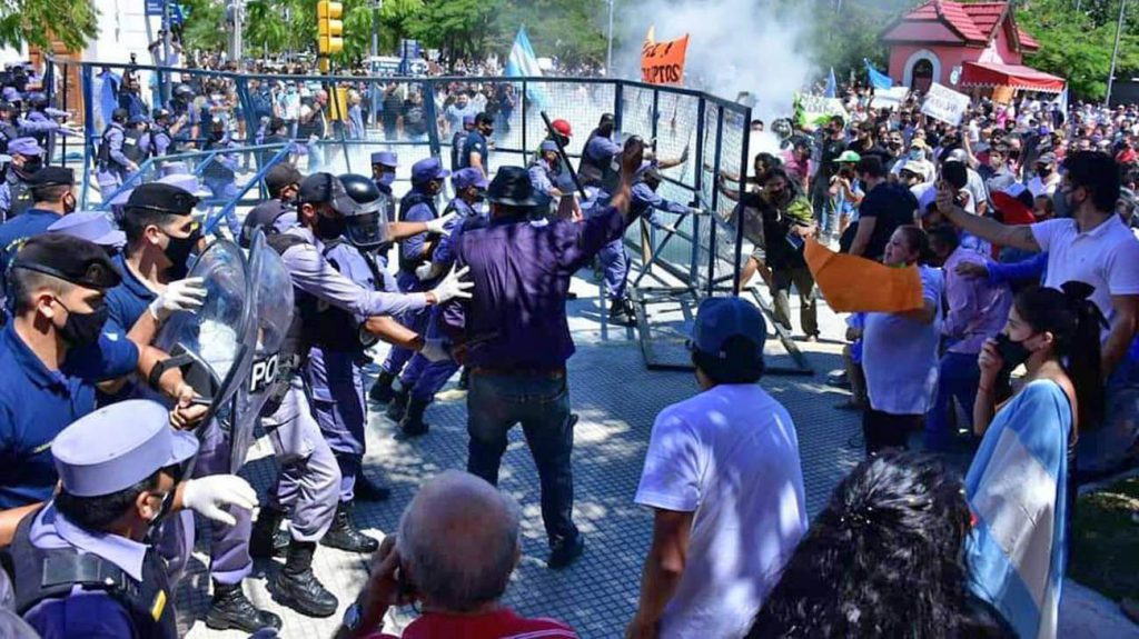 En el día de hoy, durante una manifestación de vecinos y comerciantes en la capital provincial contra las medidas restrictivas a la circulación en esa ciudad, la policía local hirió con balas de goma al periodista Maxi Galarza, de Radio Fantasía. También fue detenida otra periodista, Julieta González, de Radio Parque. Hasta el momento, no hubo información sobre las razones de su detención.