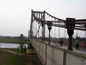Su estructura metálica consiste en un tablero suspendido de 32 cables, cada uno de ellos compuesto de 169 alambres de acero dispuestos en capas concéntricas. Los cables se anclan en dos macizos de hormigón que al mismo tiempo sirven de estribos al puente y de apoyo a la viga de rigidez.