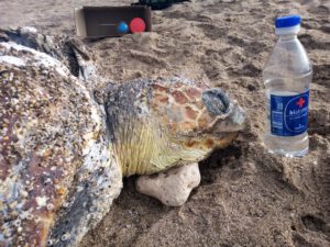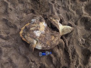 Como resultado de las observaciones, se determinó que era una hembra de tortuga cabezona _(Careta careta)_, de 94 cm de largo y un peso calculado de entre 30 y 40 kg. Con un corte que casi desprende el cuarto delantero derecho del animal. Evidencia de un mortal encuentro con la hélice de un barco grande.