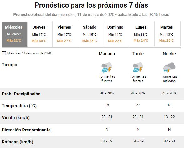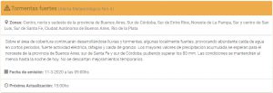 Se espera para ese área de cobertura el desarrollo de lluvias y tormentas -algunas localmente fuertes-, con abundante caída de agua en cortos períodos. También, fuerte actividad eléctrica, ráfagas y caída de granizo.