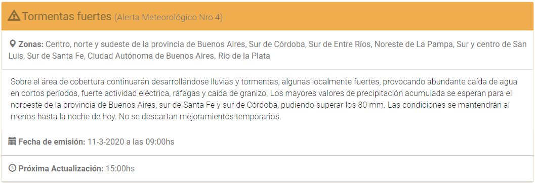 El Servicio Meteorológico Nacional emitió esta mañana un alerta por tormentas fuertes para el centro, norte y sudeste de la provincia de Buenos Aires, sur de Córdoba, sur de Entre Ríos, noreste de La Pampa; sur y centro de San Luis, sur de Santa Fe y Ciudad Autónoma de Buenos Aires