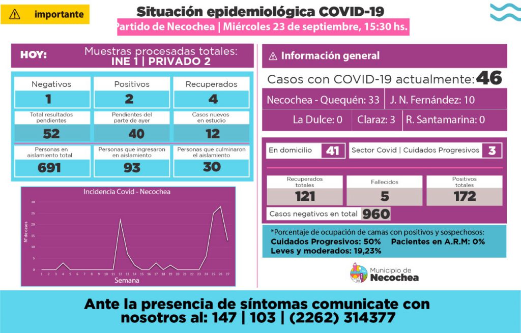 4 pacientes recibieron al alta y hay 46 casos activos en el distrito. De ellos, 33 corresponden a Necochea y Quequén; 10 a Fernández y 3 a Claraz.