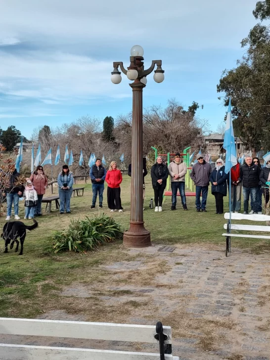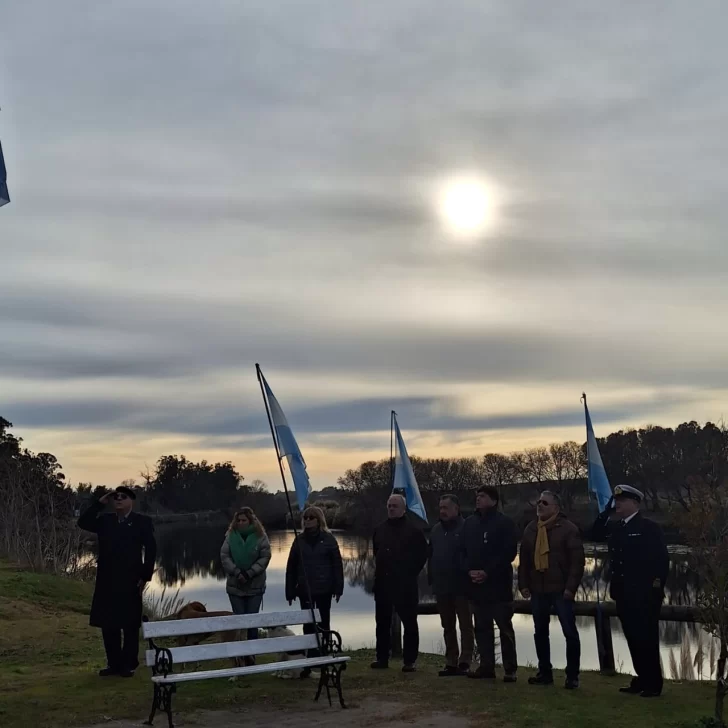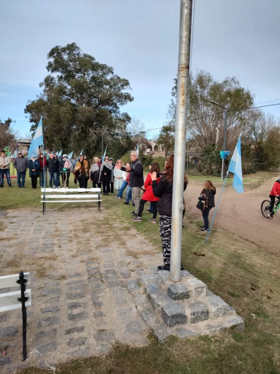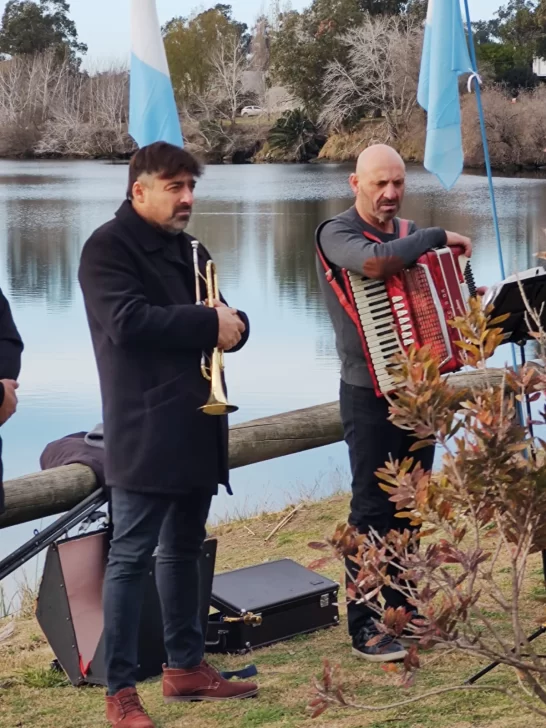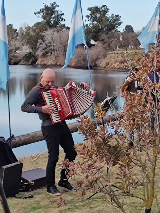 El emotivo acto protocolar con el izado de la enseña patria en el mástil ubicado a la altura del kilómetro 2, en el camino ribereño entre 86 bis y 88 bis contó con la participación del músico Juan Gesualdi que acompaño con su acordeón las estrofas del Himno Nacional Argentino.