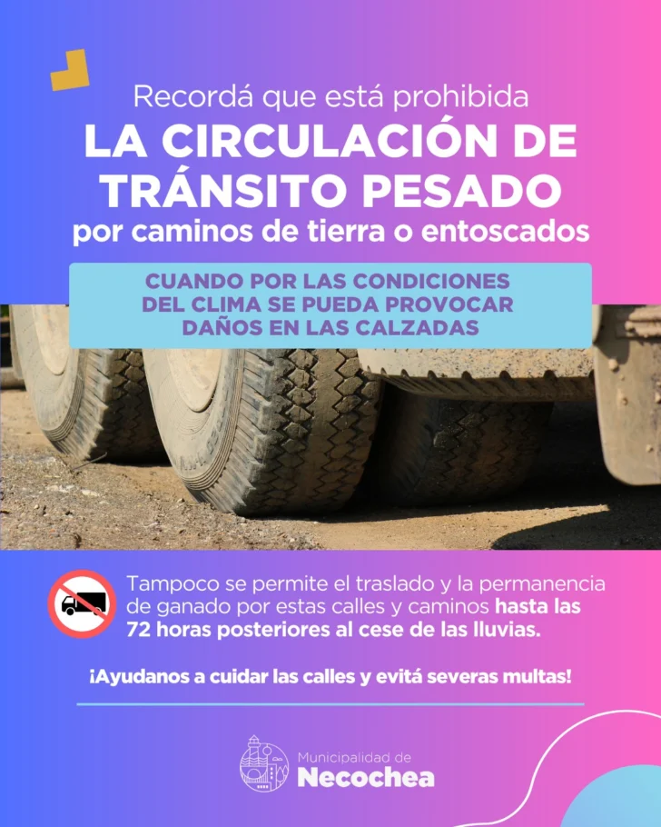 El Ente Municipal de Servicios Urbanos y Rurales (EMSUR) recordó que está prohibida la circulación de camiones con o sin acoplado en todos los caminos rurales y calles de tierra del distrito, tanto mientras llueve como durante las 72 horas posteriores a las precipitaciones. Esta medida busca preservar el estado de los caminos y calles, que se deterioran gravemente con el paso de vehículos pesados en condiciones de humedad.