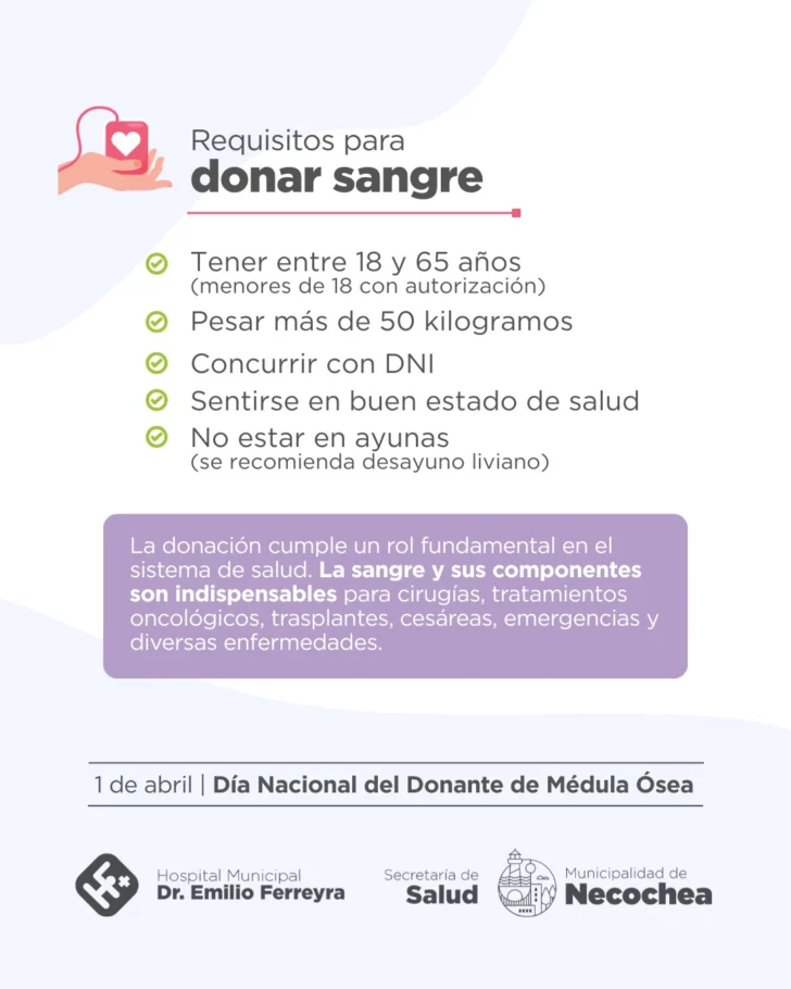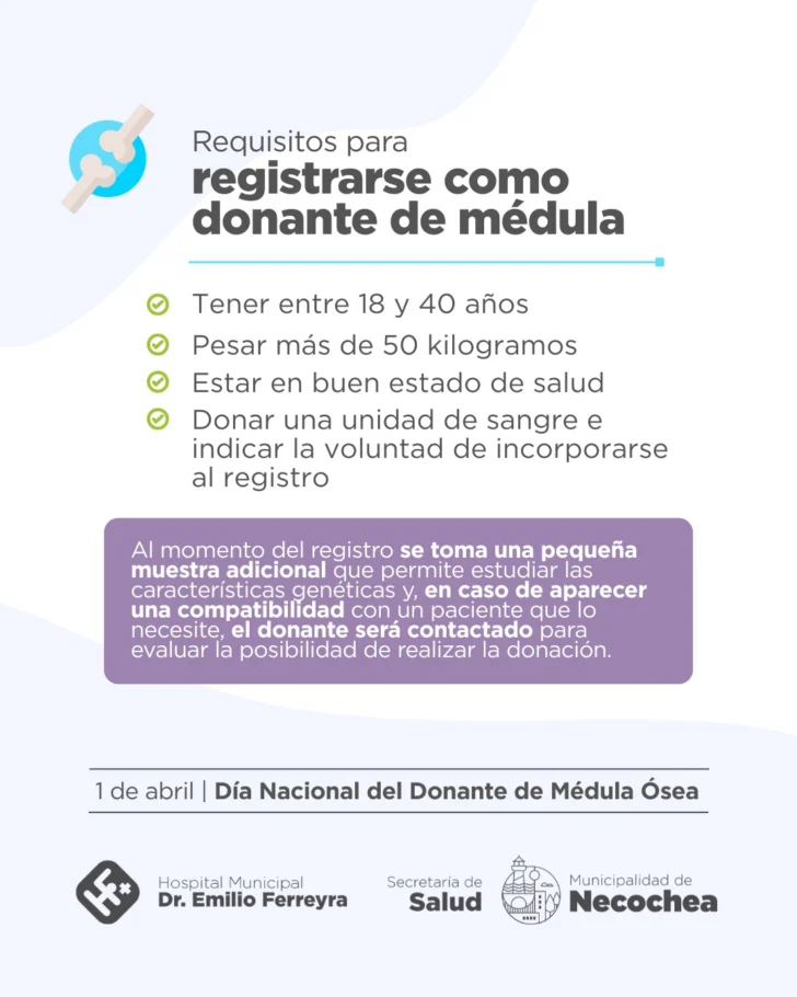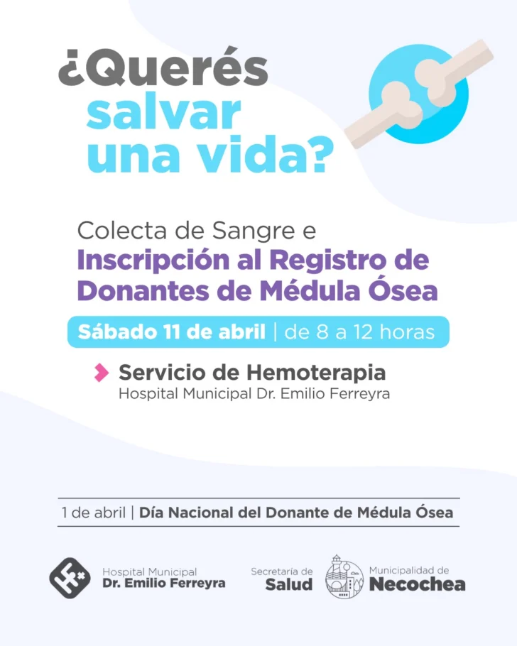 En el marco del Día Nacional del Donante de Médula Ósea, que se conmemora cada 1 de abril, el servicio de Hemoterapia del Hospital Municipal Emilio Ferreyra invita a la comunidad a participar de una jornada de donación voluntaria de sangre y registro de donantes de médula ósea.