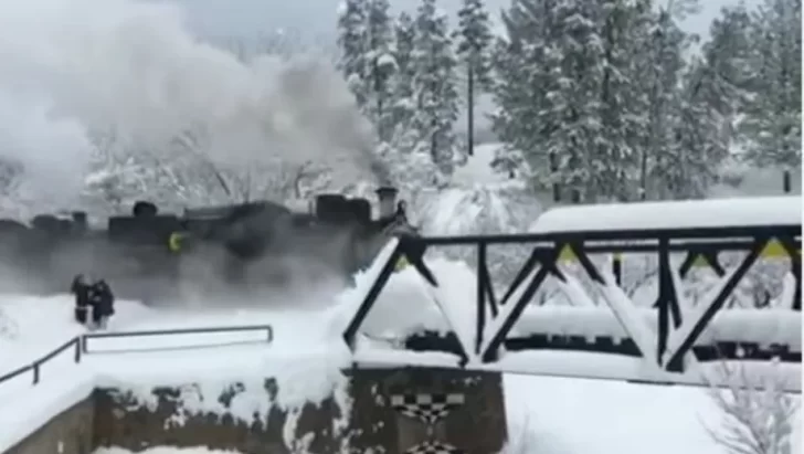 Así avanza la Trochita entre el manto de nieve blanco en la Patagonia. Video: NA/Turismo Trevelin