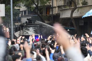 Militantes y funcionarios del Frente de Todos tiraron el vallado para acercarse al departamento de la vicepresidenta y confrontan con las fuerzas de seguridad de la Ciudad de Buenos Aires.