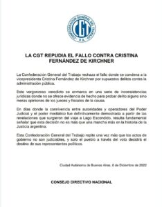 La Regional Necochea de la Confederación General del Trabajo difundió un  comunicado del consejo directivo de la CGT nacional en el cual repudian el fallo donde se condena a la vicepresidenta Cristina Fernández de Kirchner por supuestos delitos contra la administración pública.