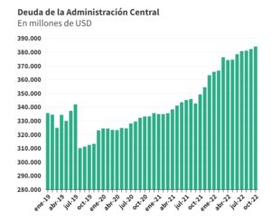 “En el décimo mes de 2022, el stock de deuda bruta ascendió a un monto total equivalente a USD 384.108 millones, de los cuales USD 381.684 millones se encuentra en situación de pago normal; y de ese monto el 33% es pagadero en moneda local mientras que el 67% restante, en moneda extranjera”, informó la Secretaría de Finanzas.