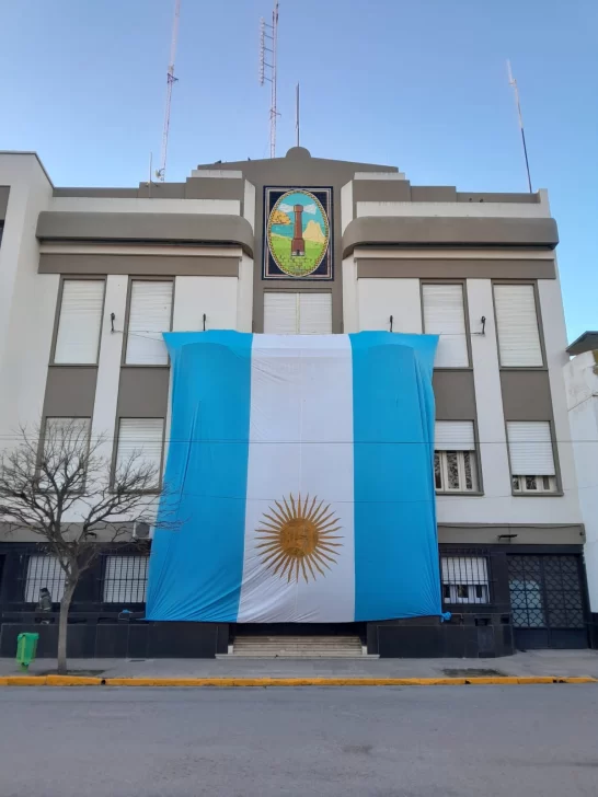 Como cada 20 de junio, desde hace algunos años, en honor al creador de la bandera nacional, la municipalidad de Necochea luce los colores patrios con la enorme bandera que cubre su fachada.