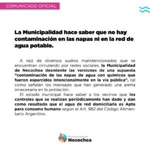 La municipalidad comunicó hace instantes que, a raíz de diversos audios malintencionados que se encuentran circulando por redes sociales, se desmienten las versiones de una supuesta “contaminación de las napas de agua con químicos que fueron esparcidos intencionalmente en la vía pública”, tal como señalan los mensajes que han generado una alerta innecesaria en la población.