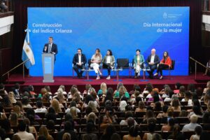 En el marco del Día Internacional de la Mujer y desde el auditorio del Banco Nación, Sergio Massa anunció la construcción del Índice Crianza (IC) junto con la directora nacional de Economía, Igualdad y Género, Sol Prieto.
