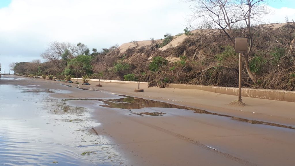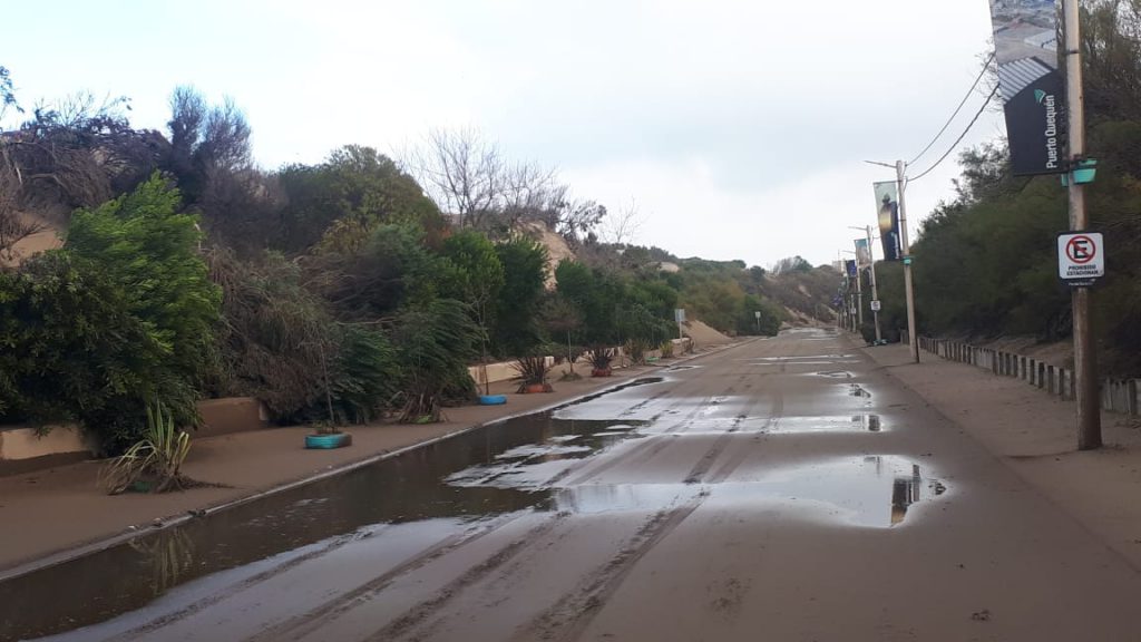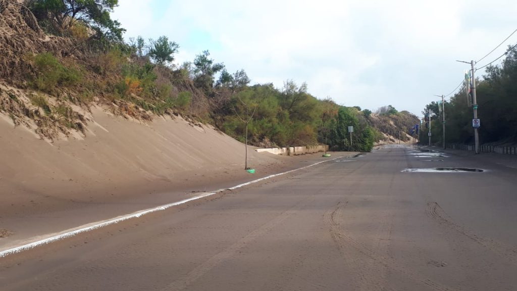 Tras el alerta meteorológico de la madrugada del domingo 31 de mayo, las fuertes ráfagas de viento, superiores a 70 km/hora, afectaron la forestación lindante al Sendero Saludable Sur colmando de arena las veredas y la calzada de la Avenida 2 en el recorrido desde la calle 63 hasta el acceso a la Escollera Sur, jurisdicción portuaria.