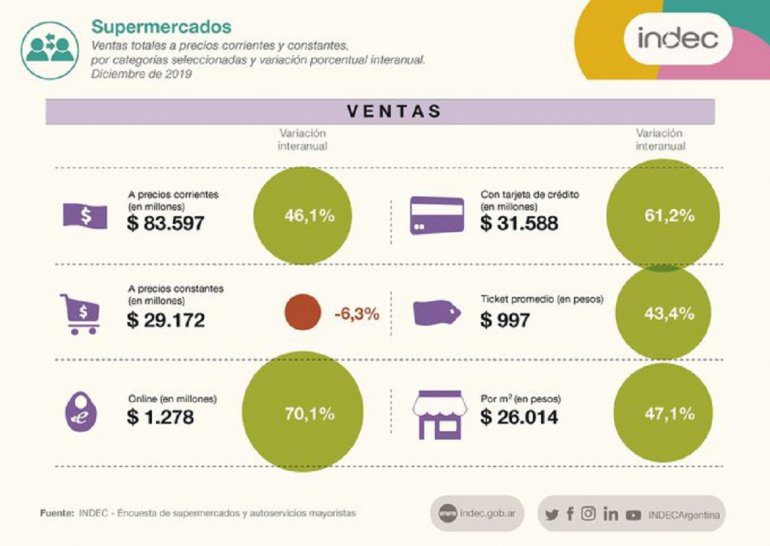 En tanto, las ventas en autoservicios mayoristas aumentaron 7,4% interanual en diciembre de 2019.