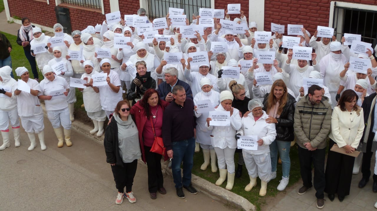 Reclamando ante el posible remate del edificio donde funciona la fábrica, las trabajadoras de Engraucoop realizaron esta mañana un abrazo simbólico al edificio y en defensa de sus fuentes laborales.