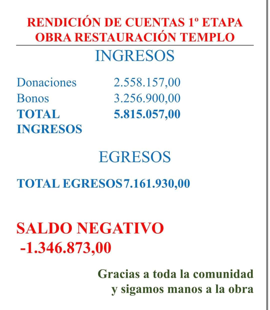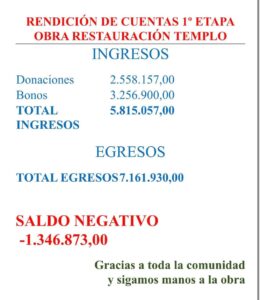 “A mi me gusta ser nítido y transparente y que toda la comunidad esté al tanto de la plata que entró y en calidad de qué fue la salida, que es mano de obra y material, fundamentalmente” explicó, al tiempo que adelantó que todavía quedan algunas cosas para poder terminar la primera etapa como es el tema de la carpintería exterior del templo.