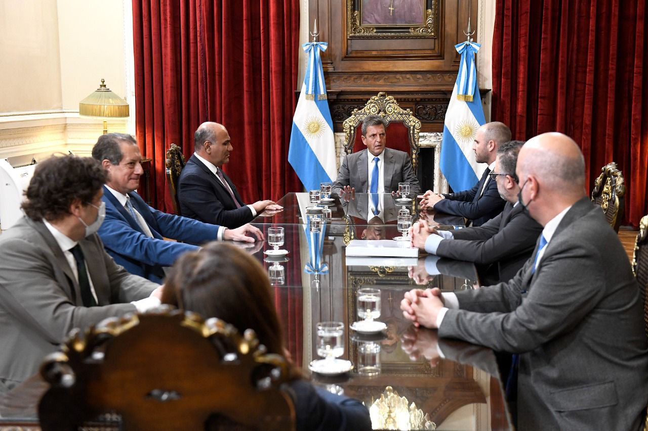 Sergio Massa recibió en el Salón de Honor al jefe de Gabinete de Ministros, Juan Manzur; el ministro de Economía, Martín Guzmán; el secretario de Hacienda, Raúl Rigo; el representante ante el FMI, Sergio Chodos; el presidente del Banco Central, Miguel Ángel Pesce, al ministro de Desarrollo Productivo, Matías Kulfas, y la portavoz presidencial Gabriela Cerruti.
