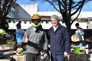 Velázquez, acompañado por los precandidatos a concejales de la Lista 4, Julio Zapata y Miguel Arana, y el subdirector de la agencia, Facundo López, observó la charla y en el cierre entregó algunos de los cascos homologados que se llevaron los presentes como premio por formar parte de esta capacitación, para fomentar su uso sobre todo teniendo en cuenta que es el elemento fundamental que disminuye los accidentes fatales que muchas veces se producen por su no uso, lo que es un acto de imprudencia total.