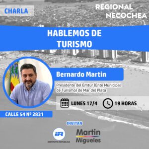 La actividad tendrá lugar en la sede del Instituto, situada en calle 54 Nº 2831, entre 57 y 59, y contará con la presencia de Bernardo Martín, presidente del Ente Municipal de Turismo de Mar del Plata (Emtur), quien brindará una exposición dinámica, en la que primará el diálogo, intercambio de opiniones, la discusión constructiva y la búsqueda de alternativas que puedan beneficiar al sector turístico de nuestra ciudad.