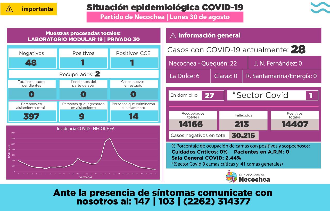 En la actualidad existen 28 contagios activos, de los cuales corresponden 22 a las ciudades de Necochea y Quequén, y 6 a la localidad de La Dulce. Se mantienen libres del virus el resto de las poblaciones del interior del distrito.