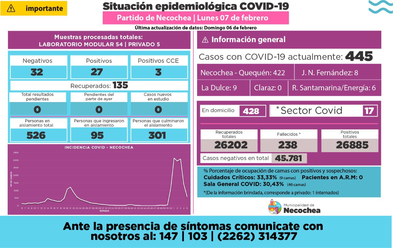 En total hay 445 casos activos en la ciudad distribuidos de la siguiente manera: 422 en Necochea y Quequén; 8 en Fernández, 9 La Dulce y 6 en Santamarina.