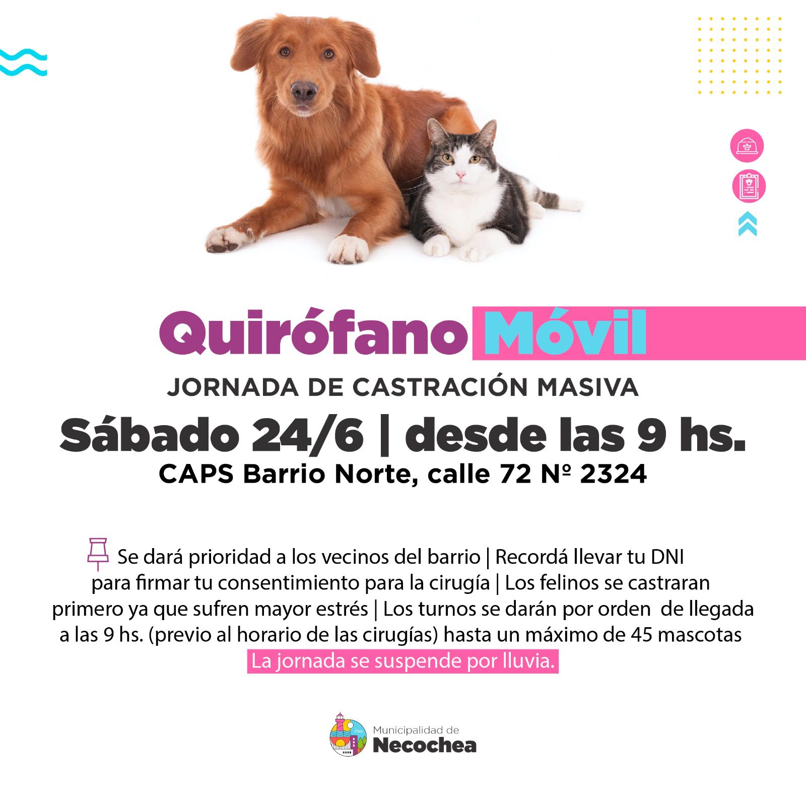 El área de Bromatología trabaja en la organización de una nueva jornada de castración masiva de perros y gatos, esta vez el nuevo centro de salud de Barrio Norte con turnos limitados. Se realizará el próximo sábado 24 y los turnos serán limitados