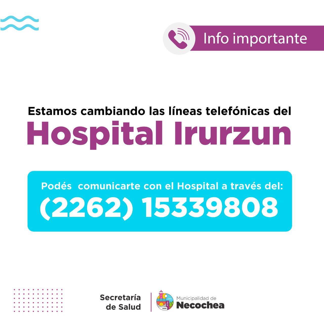 Autoridades del Hospital Irurzun de Quequén informan que solo funciona al público el celular para turnos, que es el 15339808; mientras que los fijos 450052 / 451454/450854 no están en servicio.