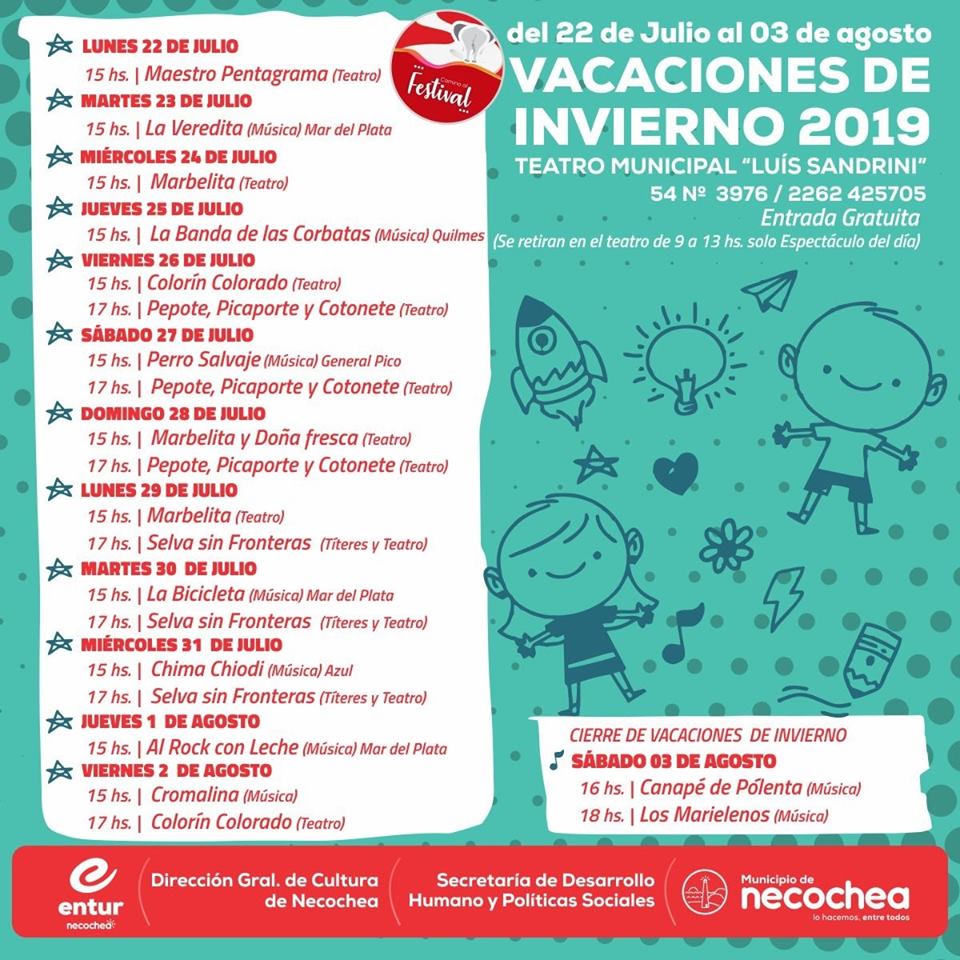 Durante las dos semanas de vacaciones, pararán varios artistas, como Marbelita, Pepote, Picaporte y Cotonete o Cromalina, e incluso espectáculos regionales de Mar Del Plata o Azul, mientras que el cierre será el sábado 3 de agosto con los números musicales locales de “Los Marielenos” y “Canapé de Polenta”.