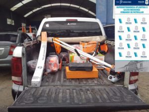 La policía los interceptó en calle 174 bis y 50 y encontraron en su poder tres desmalezadoras, una caja juegos de Tubos, un grupo electrógeno Honda, tres motosierras y un martillo demoledor.
