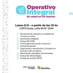 Se llevará adelante un nuevo Operativo Integral de Salud en los Barrios, para el próximo lunes, a partir de las 10 de la mañana en el Centro de Atención Primaria de la Salud del Barrio Oeste, en calle 69 N° 3504