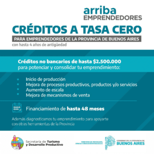 La denominación es Arriba Emprendedores y es impulsado por el Ministerio de Producción, Ciencia e Innovación Tecnológica y tiene como característica principal la tasa de interés del 0%, además de un período de gracia de entre 6 y 12 meses y un plazo para devolución en hasta cuarenta y ocho (48) meses.