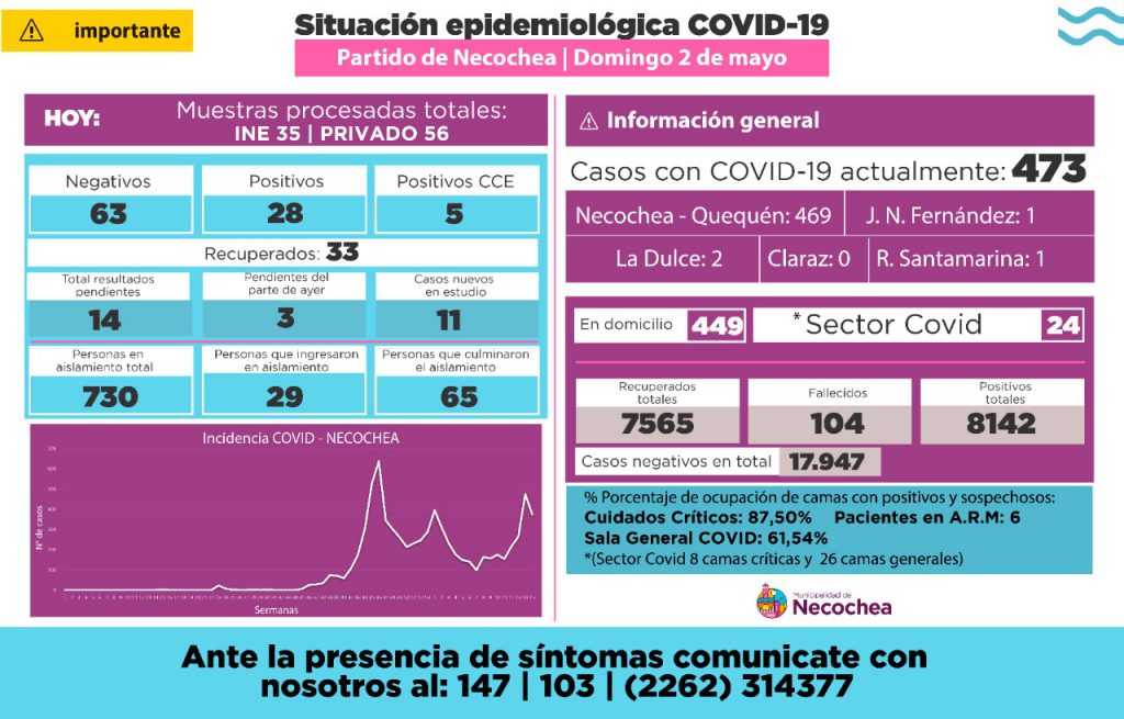 La enfermedad la cumplen en domicilio un total de 449 personas, siendo las ciudades de Necochea y Quequén las que más casos activos tienen con 469, la localidad de La Dulce registra 2 y con un solo contagio se encuentran Juan N Fernández y Ramón Santamarina. Sigue libre de coronavirus el pequeño pueblo de Claraz.