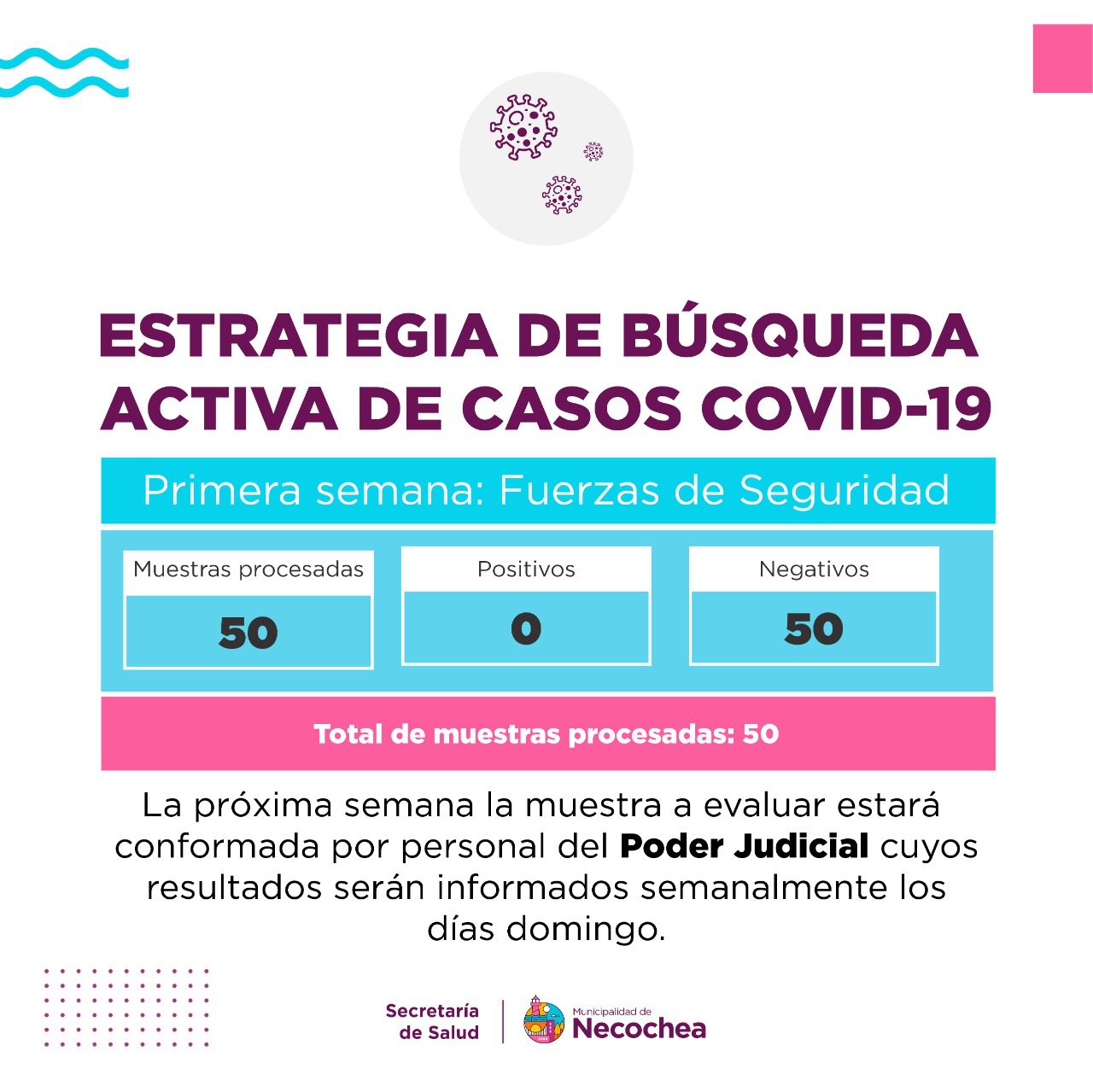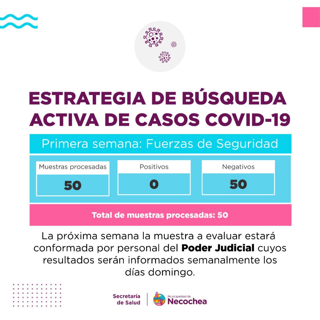 Finalmente, se brindaron los resultados de la primera semana respecto a la estrategia de búsqueda activa de potenciales casos de coronavirus. Se señaló que de 50 muestras, correspondientes a personal de fuerzas de seguridad, todas arrojaron resultado negativo. Esta semana se tomarán muestras a quienes revisten en distintos organismos del Departamento Judicial Necochea, cuyos resultados se conocerán el próximo domingo.