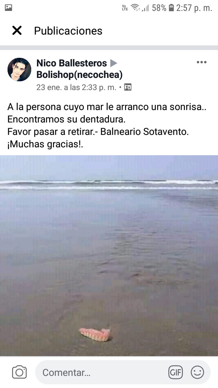 “A quien el mar le robó la sonrisa puede pasar a retirarla por Sotavento” señala en el posteo que no tardó en llenarse de cómicos comentarios y los famosos “puntitos” solidarios para que “no se pierda” la publicación.